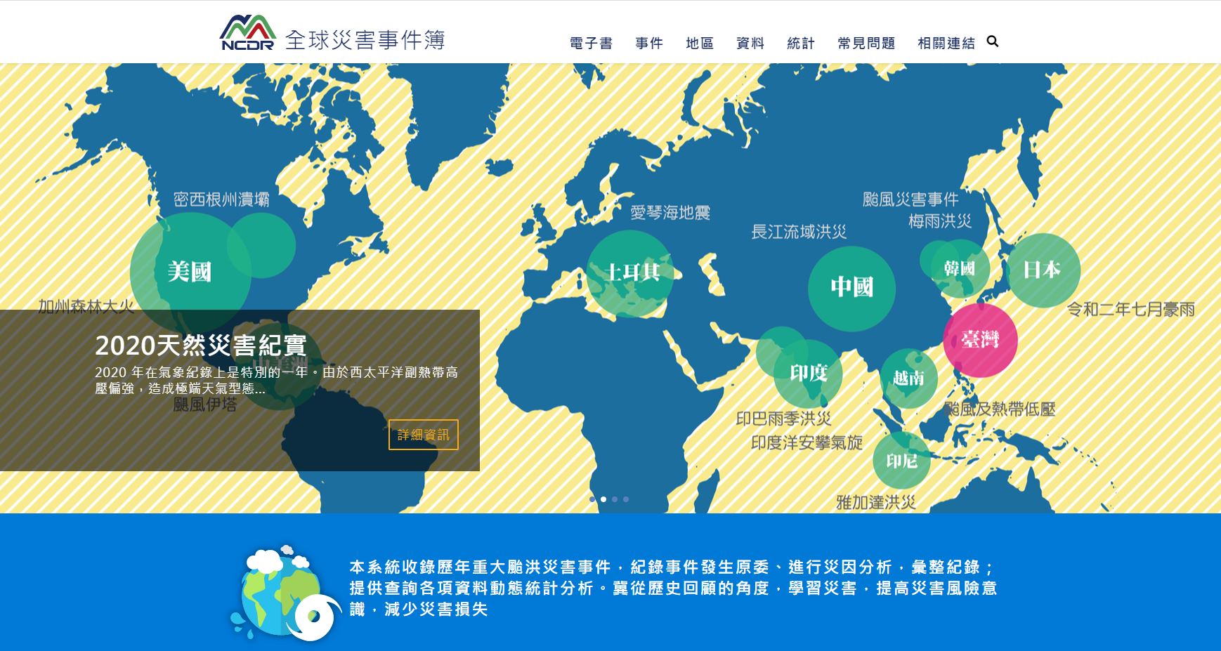 為典藏天然災害記憶,國家災害防救科技中心建置「全球災害事件簿」網站,展示歷年蒐整分析的國內外天然災害事件資料,災害種類包含:颱風、豪雨、地震、洪災、山崩、海嘯、熱浪、低溫、船難、乾旱及森林大火等項目。其中,國內颱洪災害事件約400場、國際重大災害事件達100場以上。網站的全球天然災害主題展館、數據圖表化以及資料庫直覺查詢功能,都是透過使用者經驗分析開發,必能提高網站的實用性與操作便利性,以落實天然災害資料的典藏展示及教育功能。