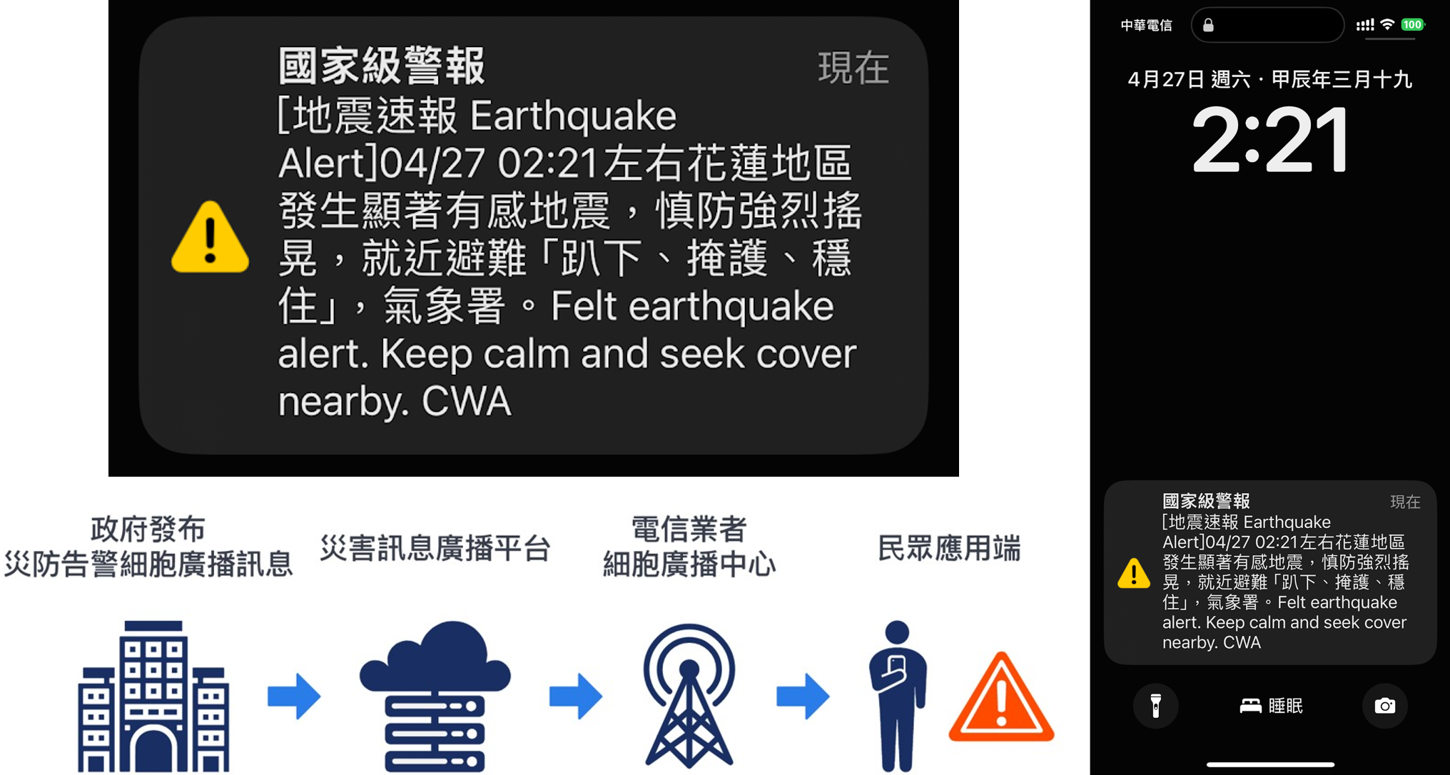 政府將災防告警訊息,經由電信業者的4G系統,利用「細胞廣播服務技術(Cell Broadcast Service,CBS)」,在短時間內以獨立通道傳遞訊息至指定基地臺涵蓋範圍內之所有行動用戶手機中,不受網路壅塞影響,以利即時通知民眾疏散,減少傷亡。