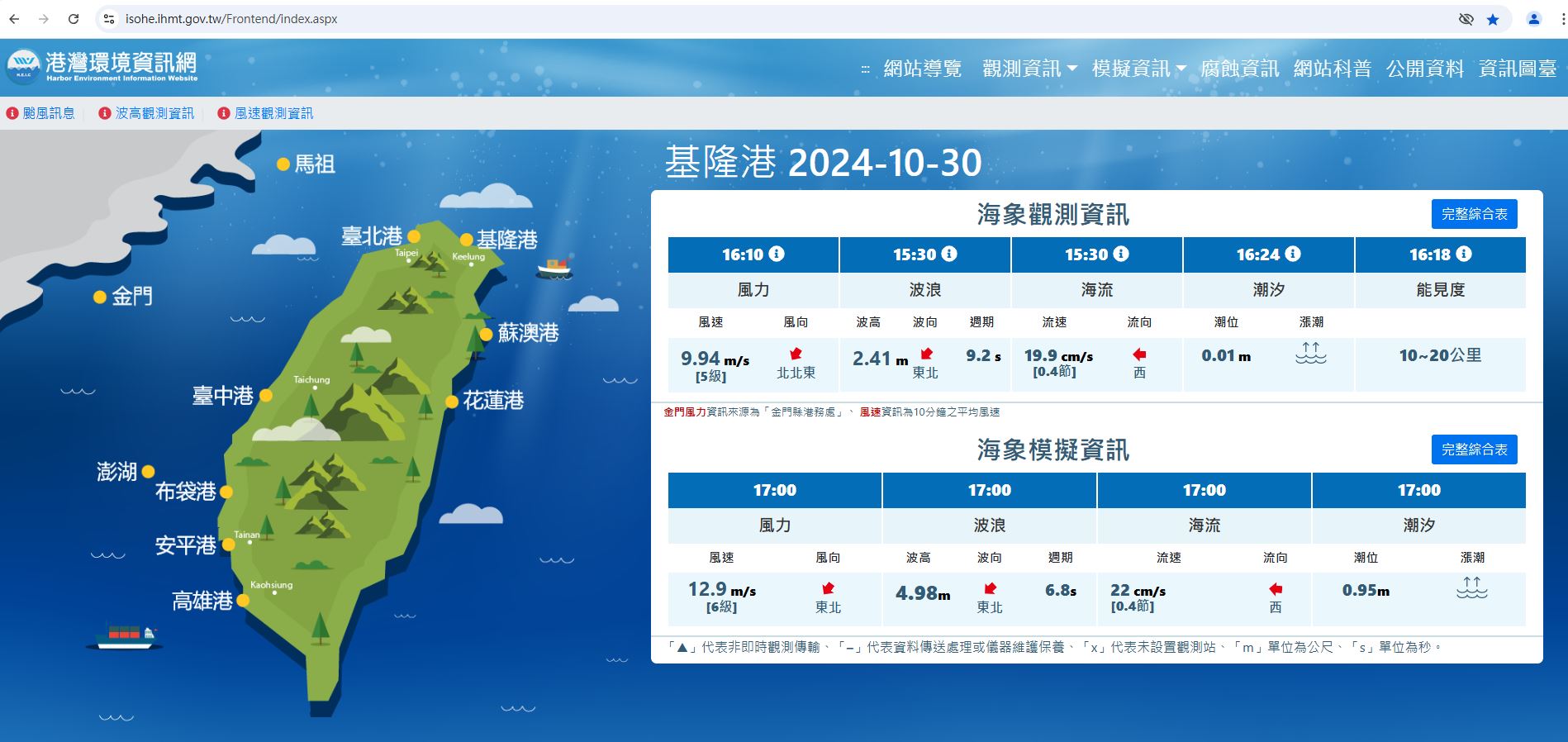 "Provides 6 functions of harbor wind, wave, tide, current, and visibility observation information, simulation information, corrosion information, website science popularity, open data and Harbor Environment Information Map. Oceanographic observations and simulation data, in the harbor area of earthquake, and classification information of Taiwan's atmospheric corrosion environment available in all varieties.