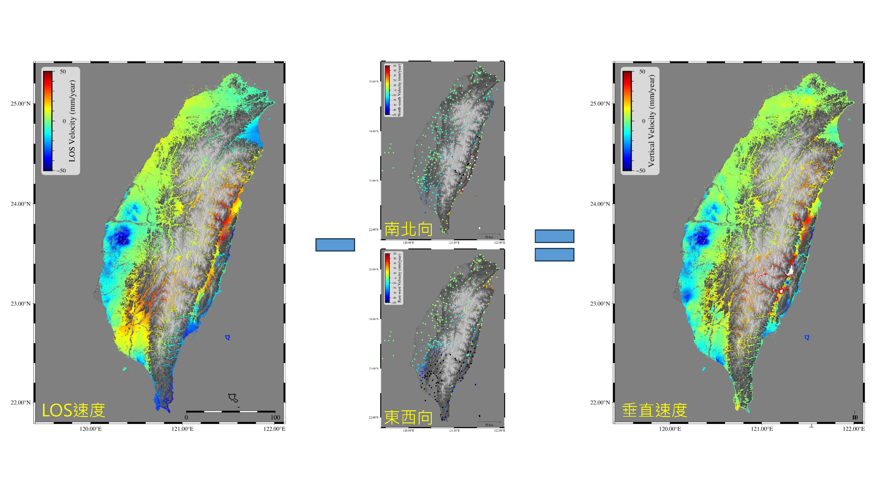 本項成果蒐集自2019年至2023年全臺灣共146張之Sentinel-1影像,雷達衛星影像根據永久散射體雷達差分干涉標準流程進行處理,最後得到Sentinel-1之全臺灣多時期形變監測成果,該觀測成果為雷達衛星視角方向,為了獲取垂直方向形變量,全臺灣永久散射體雷達差分干涉成果會利用衛星導航系統資料輔助推算,並將垂直方向PSInSAR點資料轉為網格資料進行儲存,完成五年期間之全臺灣PSInSAR相對形變速率觀測成果。成果可見自2019年至2023年五年期間全臺灣地表形變狀況,其中以雲林地區之地層下陷、2022年花蓮光復地震、臺東關山地震產生的地形變狀況最為顯著,雲林地區之地層下陷速率測得每年下陷約5公分,而花東地震事件發生當下產生約15公分的地表形變,但由於觀測期間為五年,因而最後以呈現為約每年50 ~ 60 mm之形變速度,於形變解釋時需要特別小心。