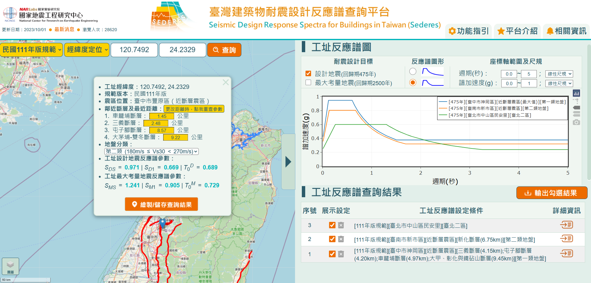 為建立系統化工具以符合建築物設計規範相關要求,國研院國家地震工程研究中心推出以地理資訊系統(GIS)導向的「臺灣建築物耐震設計反應譜查詢平台(Sederes)」。Sederes旨在便捷且高效地協助產、官、學界用戶進行結構分析、耐震補強、防救災規劃等地震安全評估作業。Sederes整合了最新的國家底圖、行政區劃、活動斷層跡線和門牌地址定位系統等多項政府開放圖資,以地圖及圖表的形式清楚呈現所有重要的規範設計地震資訊,對工程實務、學術研究和知識教育具有顯著應用價值。