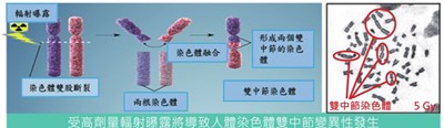 染色體雙中節分析法係一種人員生物劑量評估技術,透過分析經輻射照射之細胞產生的雙中節個數,回推人員所接受到的輻射劑量。當發生輻射意外事故時,可利用該技術評估未配戴劑量佩章之民眾或工作人員所接受輻射劑量,並作為後續醫務監護作業之重要參考。
