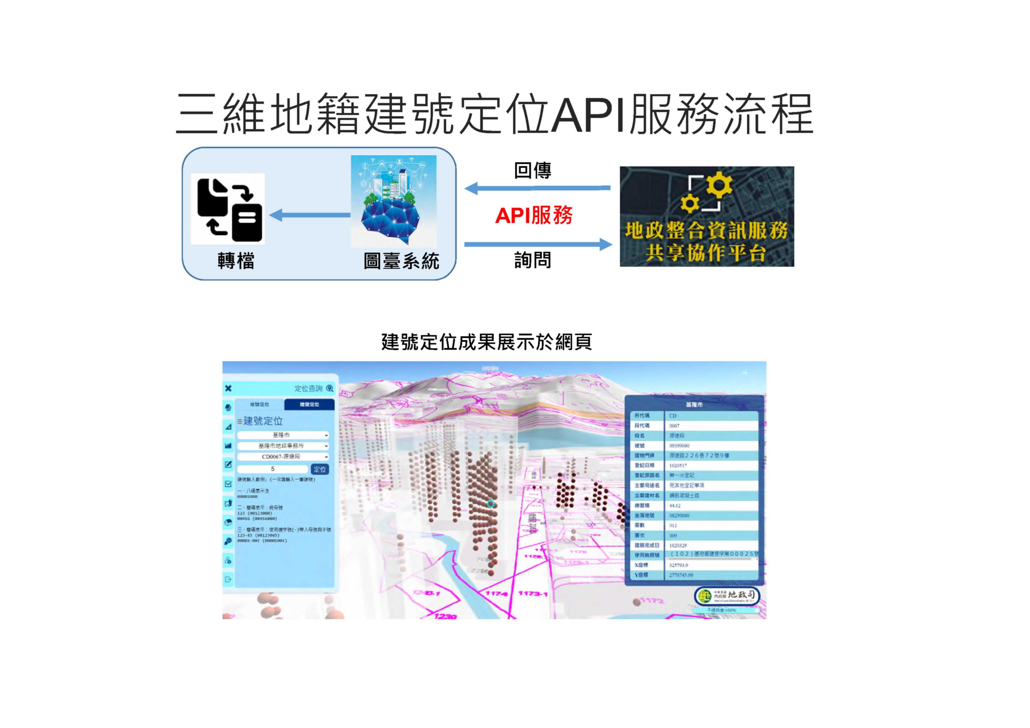 使用API技術快速提供產權建物於空間中三維坐標,縮短處理的時程以增加決策及規劃的時效性。