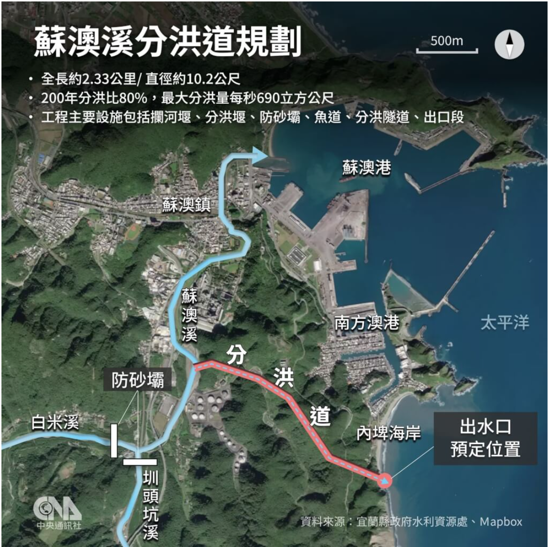 蘇澳溪分洪道全長約2.33公里,採自然溢流分洪將蘇澳溪水引至內埤海岸南側出海,降低水患風險。(中央社製圖)