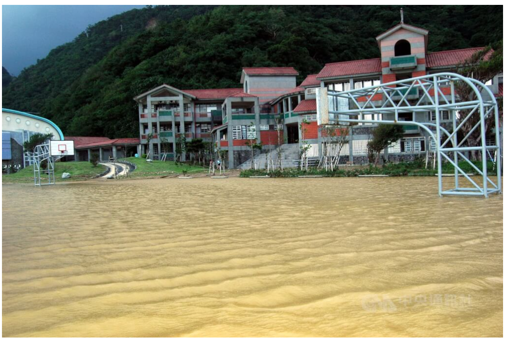 2010年10月颱風梅姬造成宜蘭蘇澳南安國中操場嚴重積水。(中央社檔案照片)