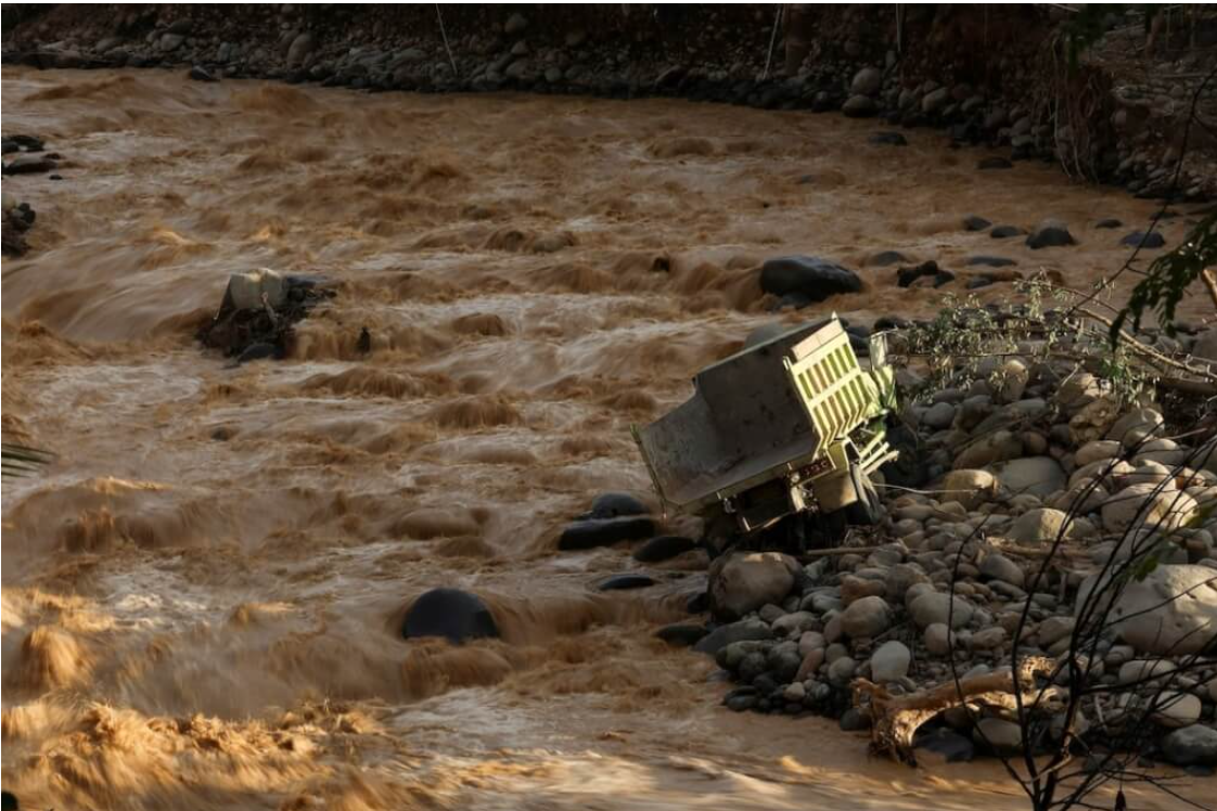 印尼蘇門答臘一輛卡車因暴漲洪水受困。(路透社)