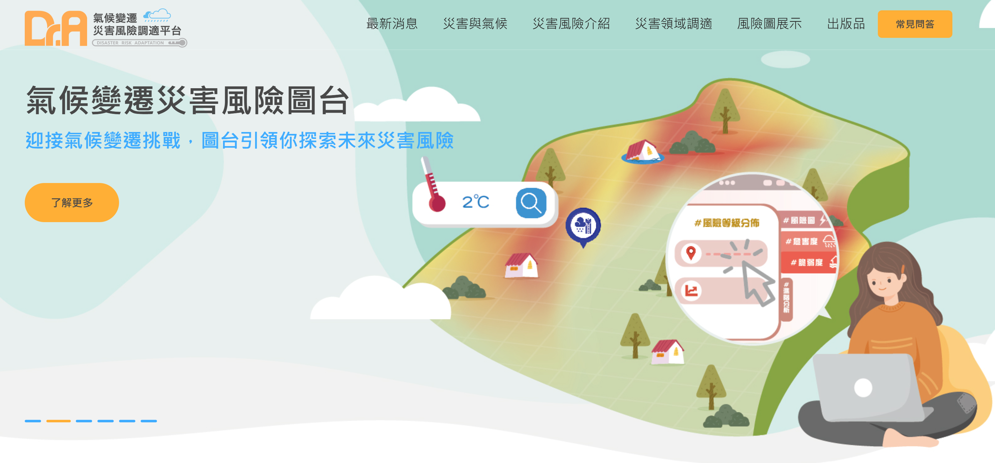 In "Disaster Risk Adaptation" platform (also known as Dr. A), users can find research results for disaster risk and adaptation. Users can also search for climate trends and statistical data of the present and the future, disaster risk assessment methods, disaster risk maps and tools, simulations for extreme weather disasters, disaster adaptation strategies, as well as the latest news for climate change disaster impacts and popular science.