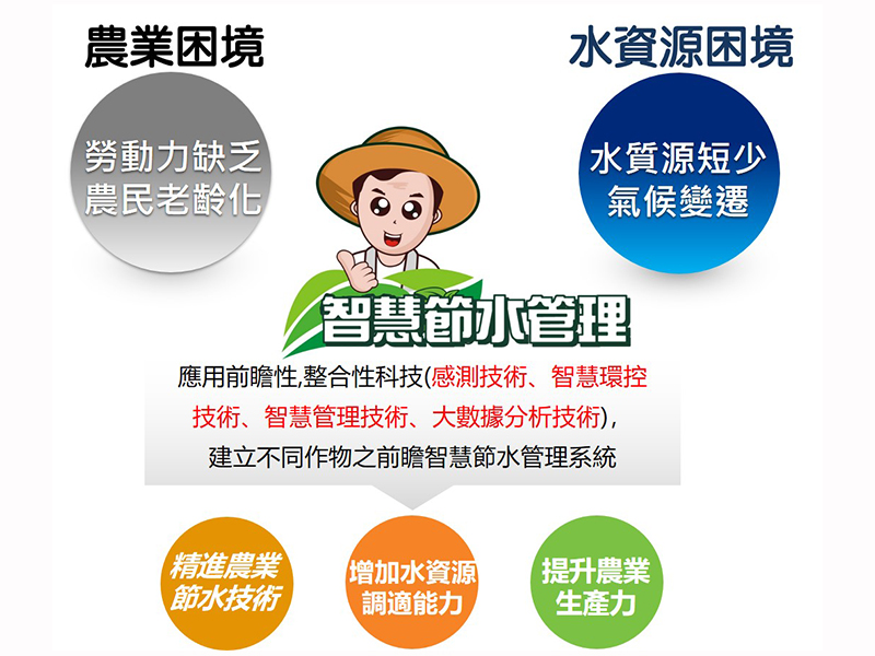 The rainfall during dry and rainy seasons differs dramatically. Steep river bed slope and climate change cause agricultural water shortage to become more severe in Taiwan. Under this crisis, researching for diversified and efficient use of water resources has become an important issue. This year, Taoyuan City is the target area for establishing the smart water-saving management system. By integrating the sensing technology of the Internet of Things (IoT) and smart environmental management, water-saving effects are tested and verified twice on-site. The development of a forward-looking smart water-saving management system provides a strategic proposal for improving water resilience under climate change.