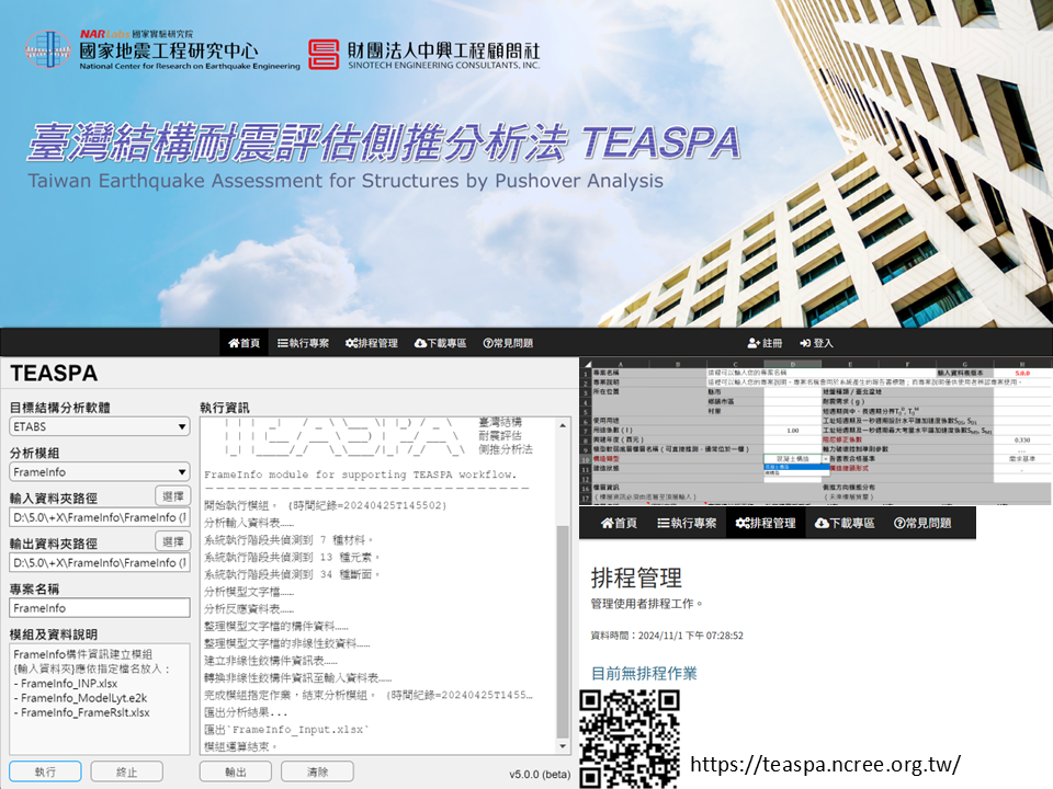 國研院國家地震工程研究中心針對一系列結構元件試體於實驗室進行地震模擬實驗後,深入探討各式結構之耐震性能及補強效益,提出「臺灣結構耐震評估測推分析法(TEASPA)」,此分析方法之柱彎矩非線性鉸性質考量斷面軸力彎矩互制曲線,可隨分析過程柱軸力變化動態調整,適用於鋼筋混凝土造或加強磚造之平面規則建築物的耐震評估,可供建築師、相關專業技師及專業機構等應用於耐震能力詳細評估工作時之參考使用,使用者仍應自負其專業責任。