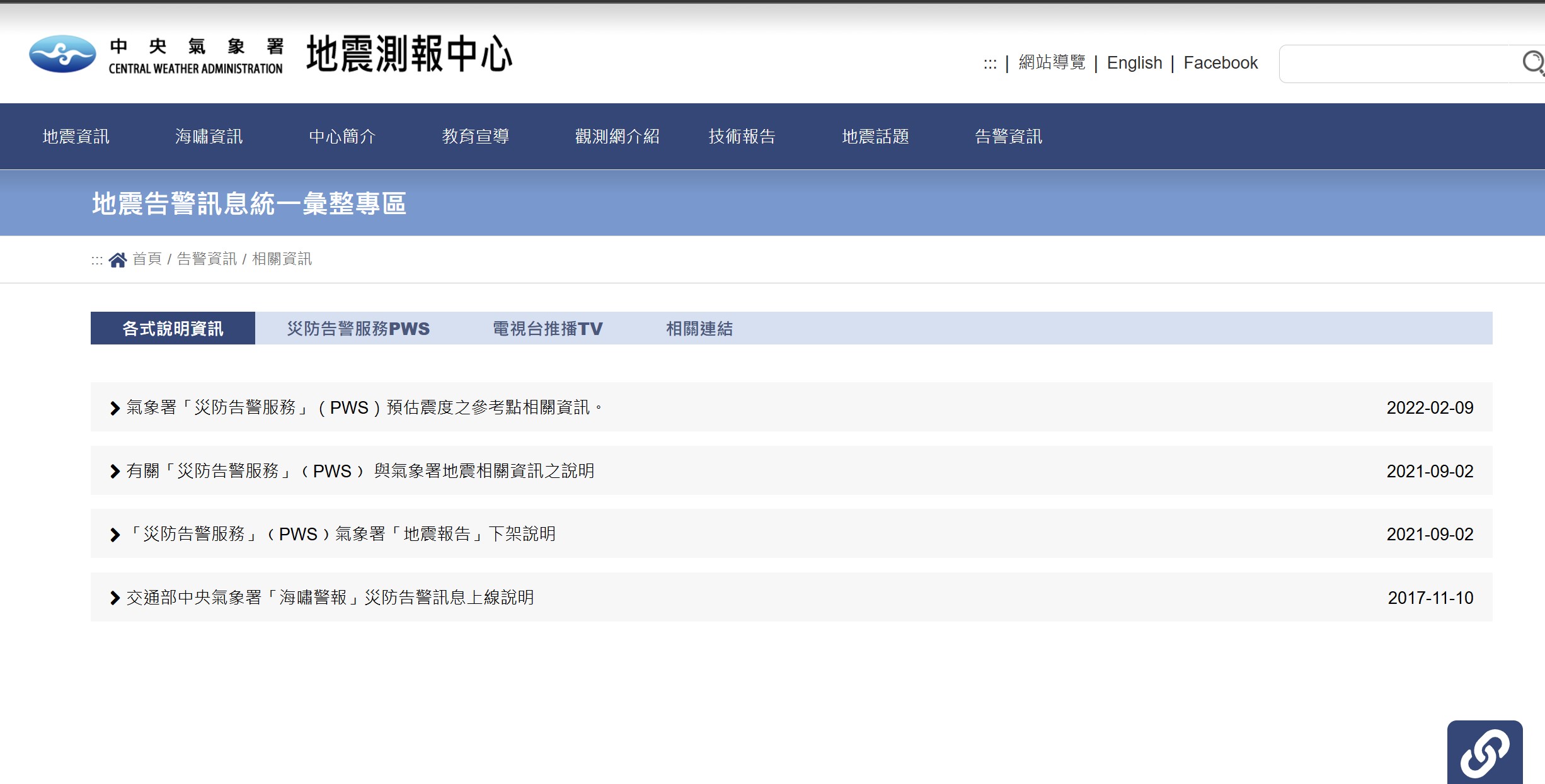 The ""Earthquake Early Warning"" issued by the "" Public Warning Service (PWS)"" is the ""Strong Earthquake Early Warning"" service of the Central Weather Administration. It is mainly based on the high-density earthquake observation network and self-developed rapid earthquake reporting technology, which is called ""Regional Strong Earthquake Warning".
