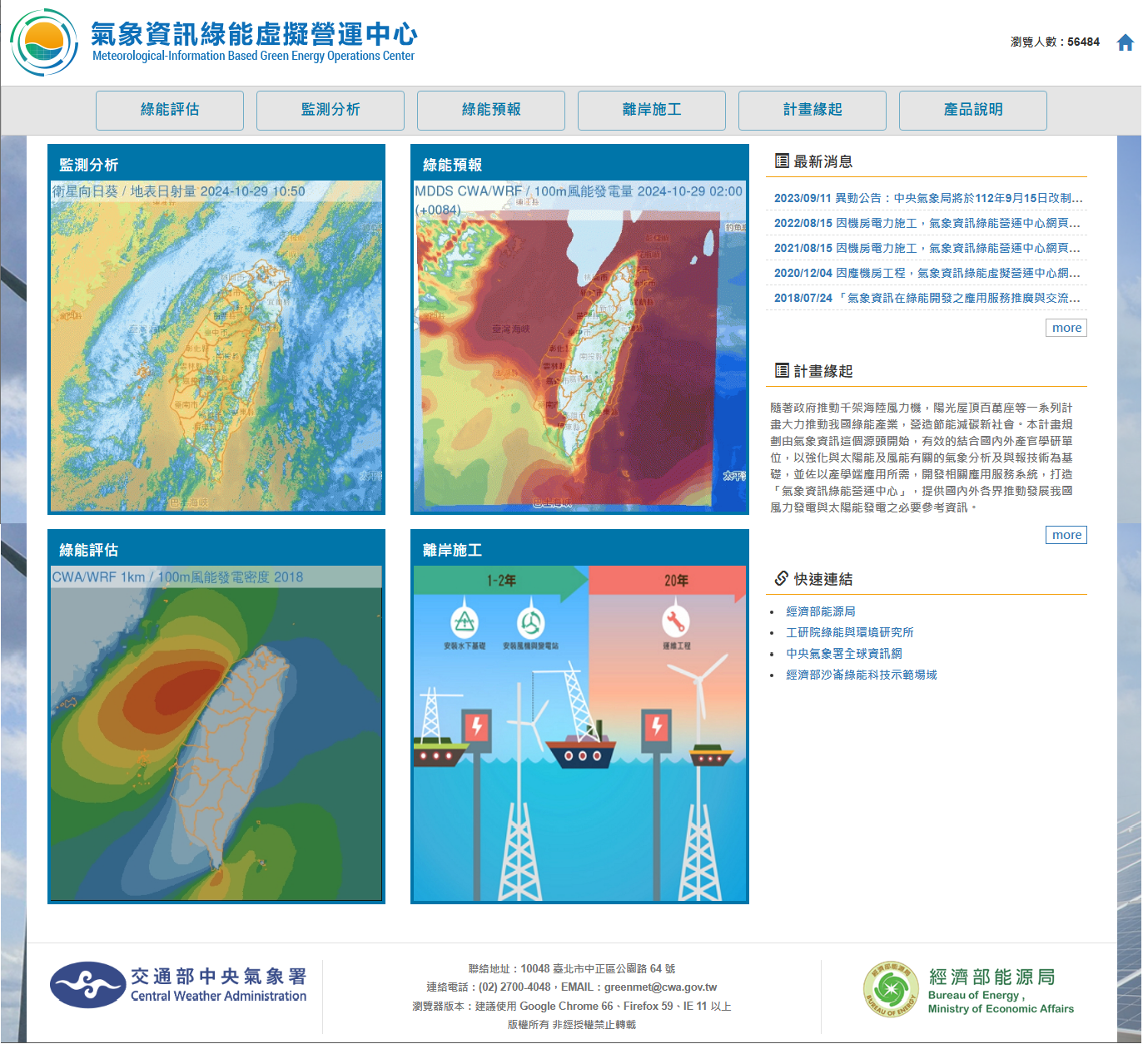 氣象資訊綠能虛擬營運中心網頁主要提供台灣地區太陽能和風能產值的歷史評估、即時現況,及預報資訊,可察看面化的能源分布,也可選特定位置看未來的趨勢變化